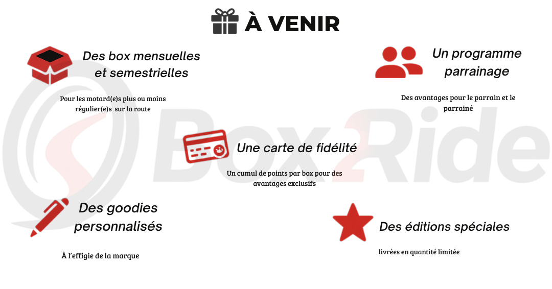 Box2Ride est une box moto trimestrielle par abonnement qui vous livre à domicile une sélection de produits d’entretien, d’accessoires, d’outils et de goodies utiles pour votre moto et vos trajets.